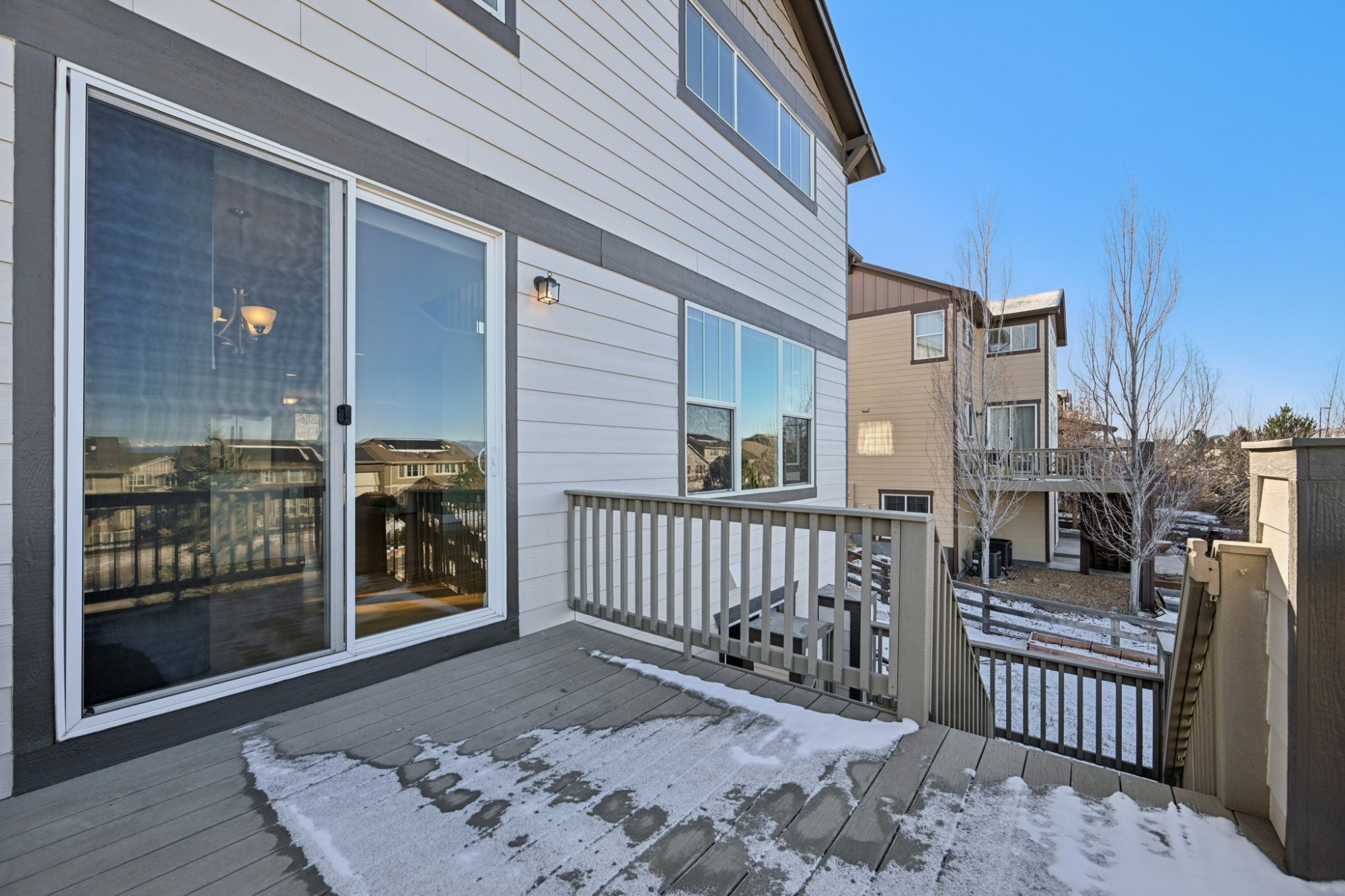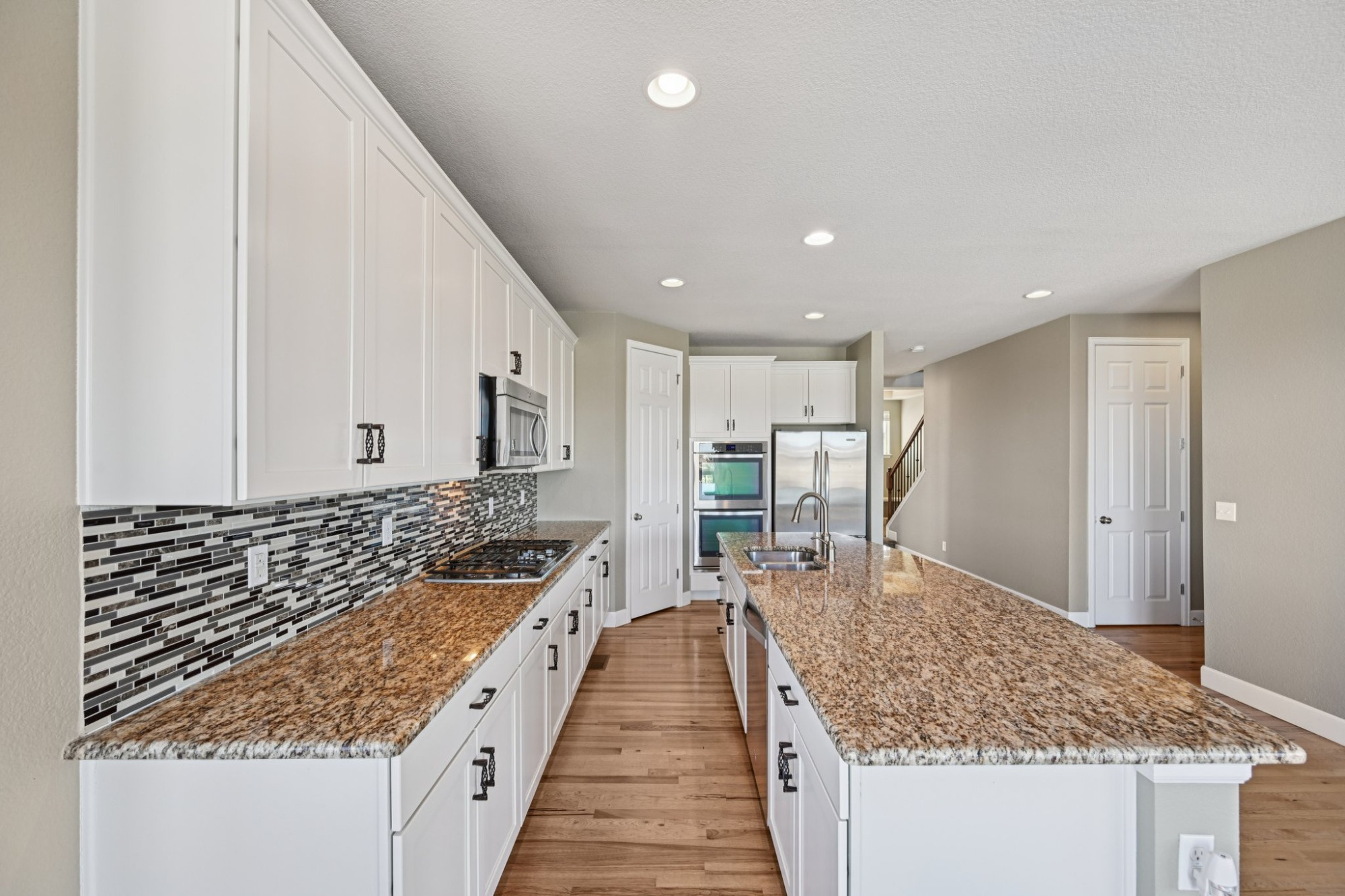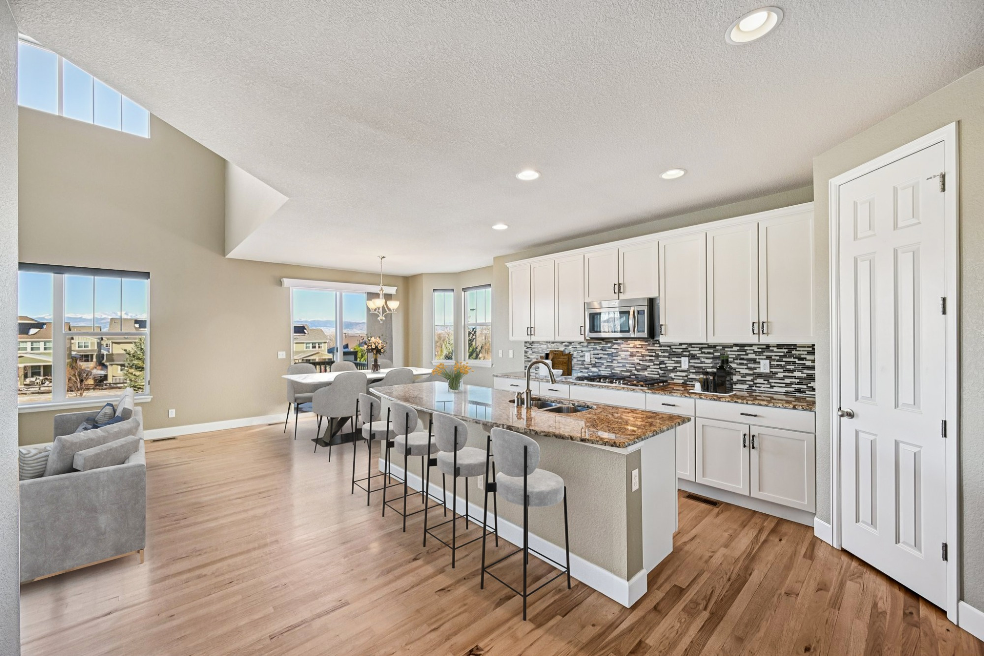 The large gourmet kitchen is a chef's delight, featuring slab granite countertops, a large island with breakfast bar seating, 42" cabinetry, mosaic tile backsplash, stainless steel appliances including a gas cooktop and double ovens, and a generous sized pantry. Designed for both everyday living and entertaining, complete with a dining area and bay windows, it flows effortlessly to the deck, ideal for enjoying those sunset views over the Front Range and snow capped peaks.