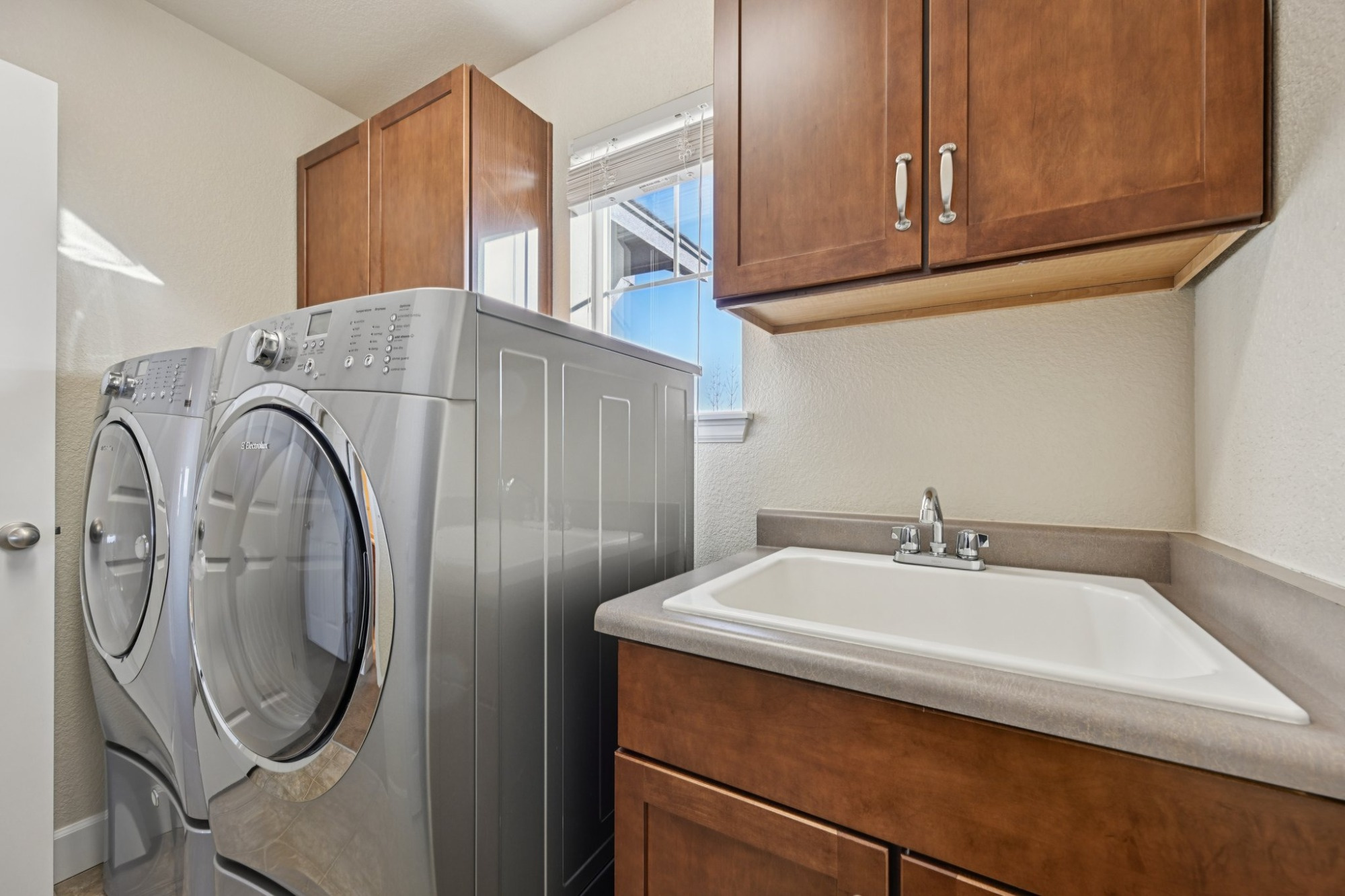 Off of the foyer are French glass doors opening to a private office, perfect for work or quiet retreat. Upstairs, a large versatile loft provides additional living space, alongside 3 well sized bedrooms and a convenient laundry room with a utility sink. The spacious primary suite is a true sanctuary, offering a raised tray ceiling, a private 5 piece bath with soaking tub and separate shower, dual vanities, and a custom walk-in closet.